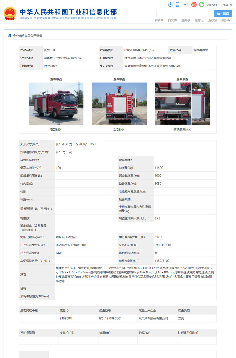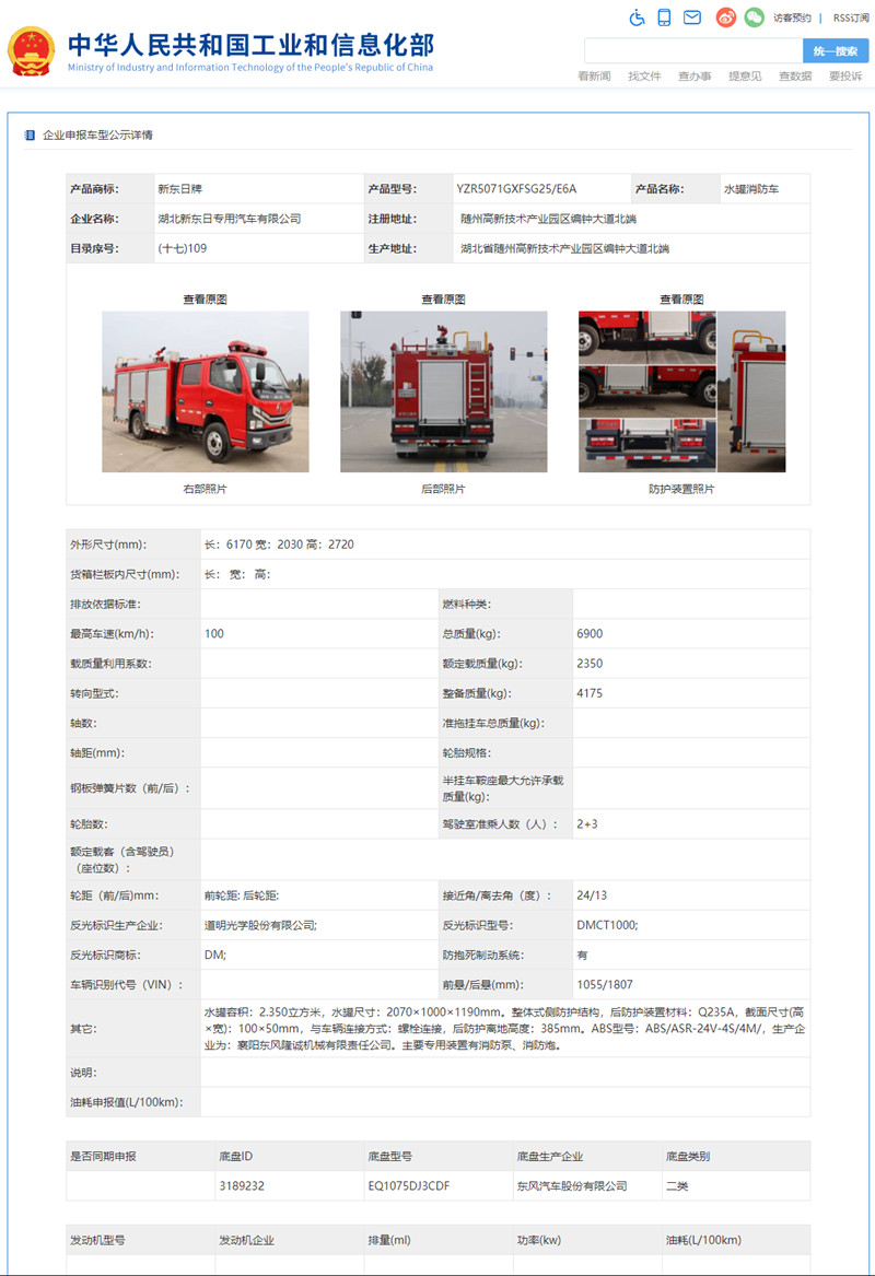 根據(jù)《道路機動車輛生產(chǎn)企業(yè)及產(chǎn)品公告》管理和《財政部 稅務總局 工業(yè)和信息化部 交通運輸部關于節(jié)能 新能源車船享受車船稅優(yōu)惠政策的通知》(財稅〔2018〕74號)的有關要求,現(xiàn)將《道路機動車輛生產(chǎn)企業(yè)及產(chǎn)品公告》(第343批)中可以看到,我公司有兩款消防車公告公示,東風2.5噸水罐消防車和東風5噸泡沫消防車。