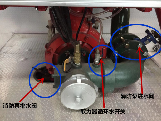 關閉消防泵進水閥,打開消防泵排水閥,關閉取力器循環(huán)水開關