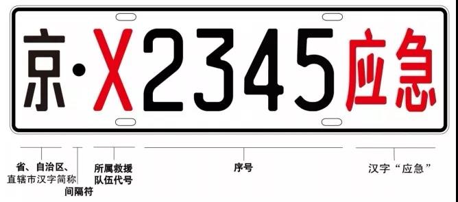 (一)汽車號牌。字符共8位,依次為省(自治區、直轄市)漢字簡稱、所屬救援隊伍代號、四位序號和漢字“應急”組成。其中,所屬救援隊伍代號用X代表消防救援、S代表森林消防。應急部的專用號牌不用英文字母,以與地方的專用號牌區別,如“京·12345應急”表示車輛歸屬應急部,“京·X2345應急”表示車輛歸屬北京市應急管理部門。